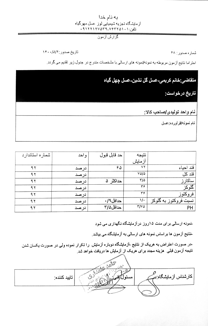 مشاهده نتیجه آزمایشگاه تجزیه شیمیایی لوز عسل