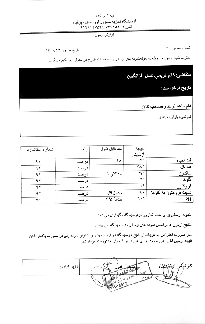 مشاهده نتیجه آزمایشگاه تجزیه شیمیایی لوز عسل